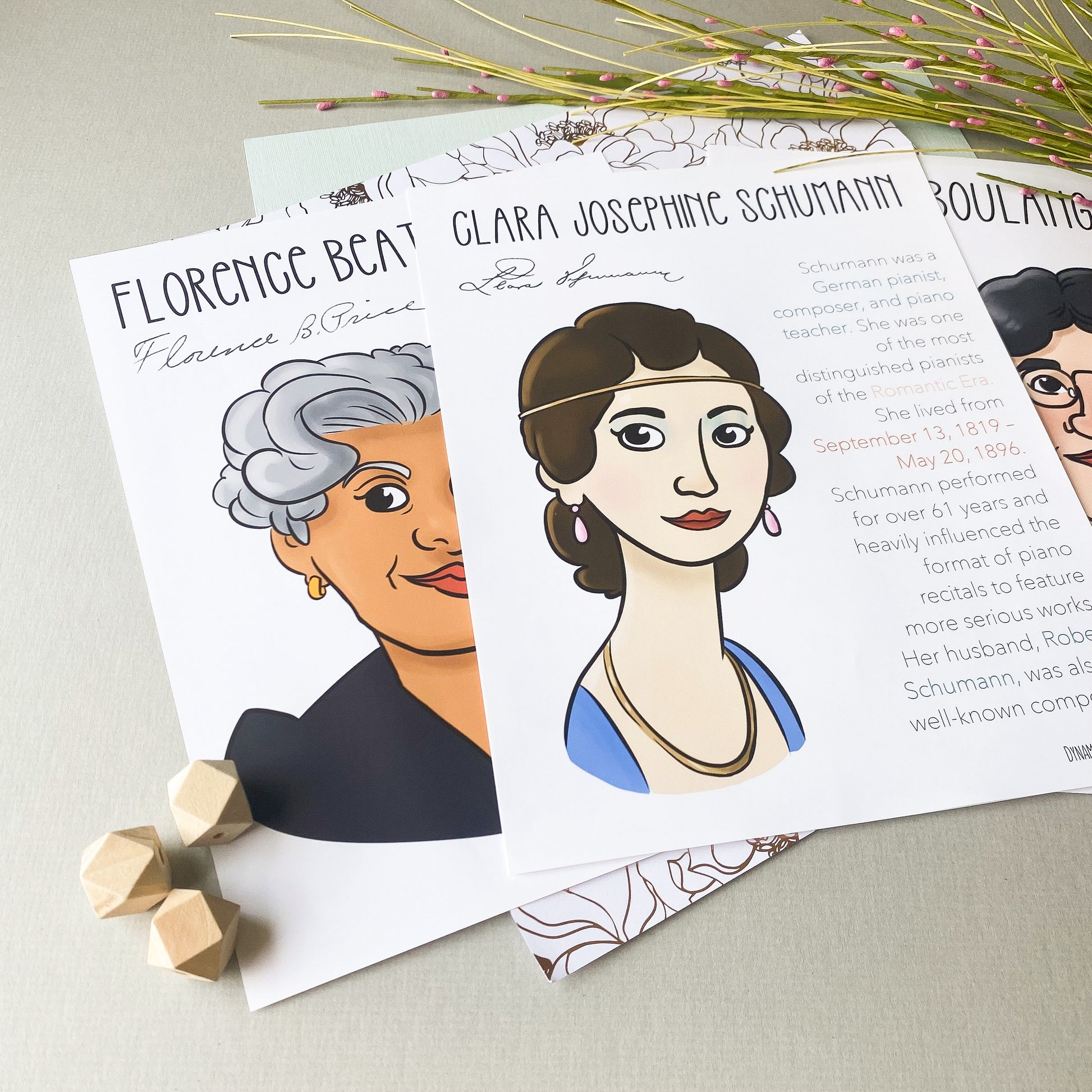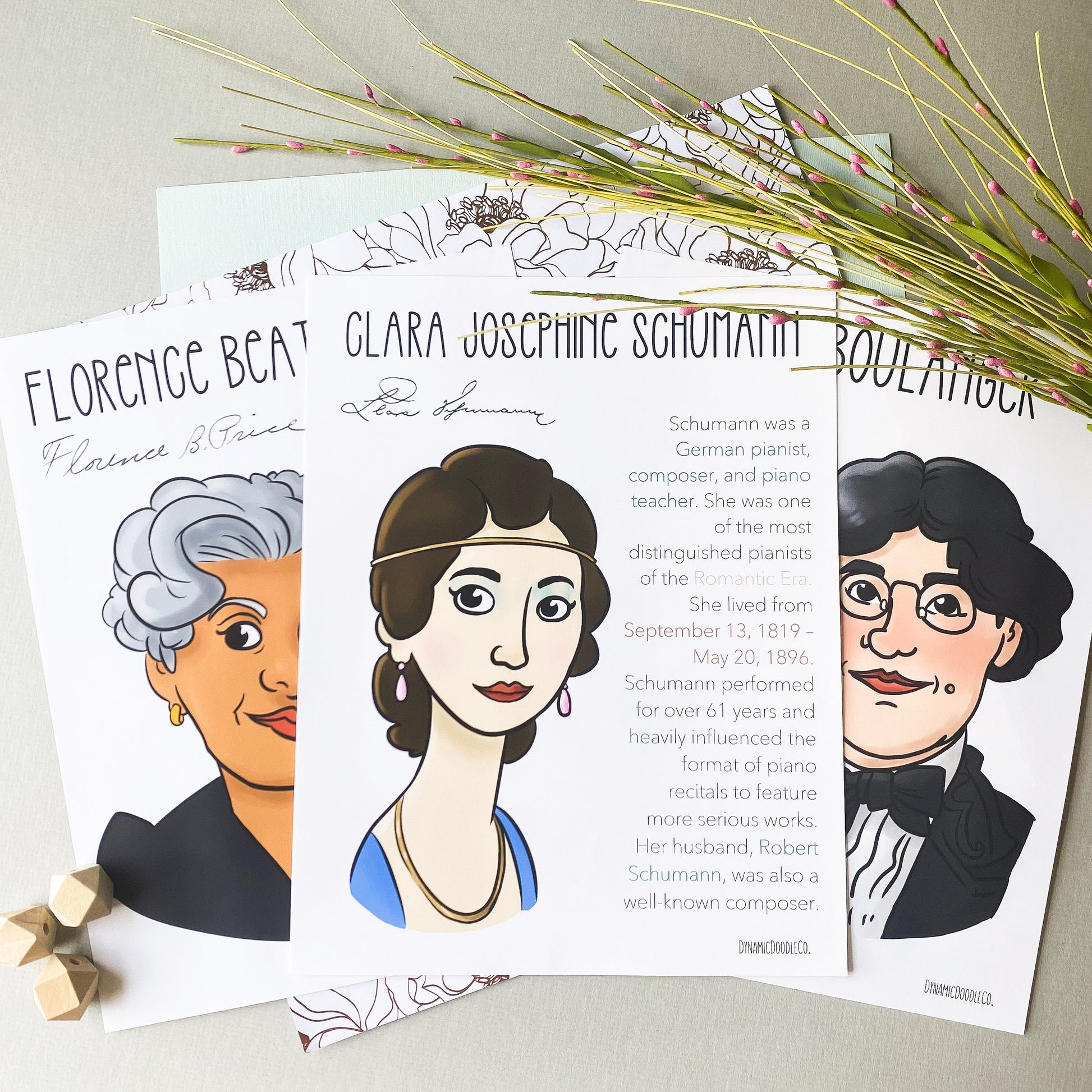 Bach, Beach, Beethoven, Bonds, Lili Boulanger, Nadia Boulanger, Brahms, Chaminade, Chopin, Rebecca Clarke, Coleridge-Taylor, Copland, Crawford-Seeger, Debussy, Dvorak, Ellington, Grieg, Handel, Haydn, Hildegard, Joplin, Keetman, Fanny Mendelssohn, Felix Mendelssohn, Mozart, Price, Ponce, Prokofiev, Rachmaninoff, St. Georges, Saint-Saens, Schubert, Clara Schumann, Robert Schumann, Smyth, Sousa, Strozzi, Tchaikovsky, and Vivaldi, Williams