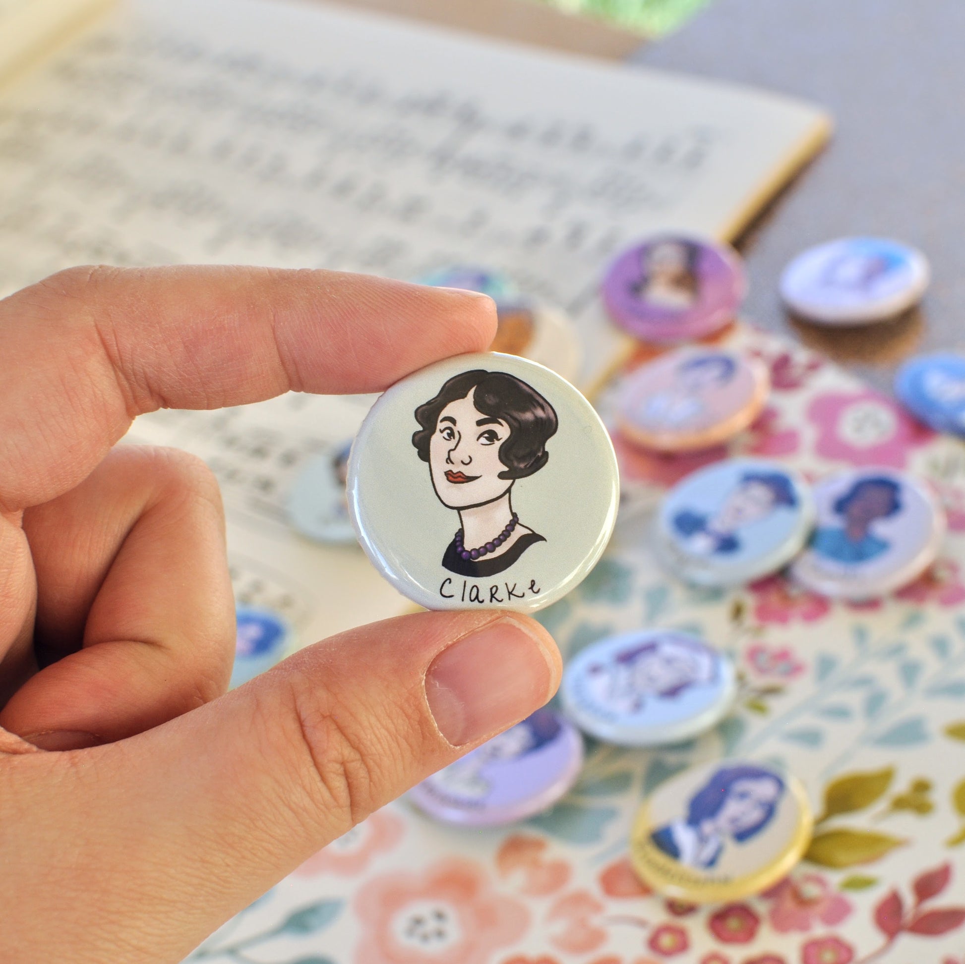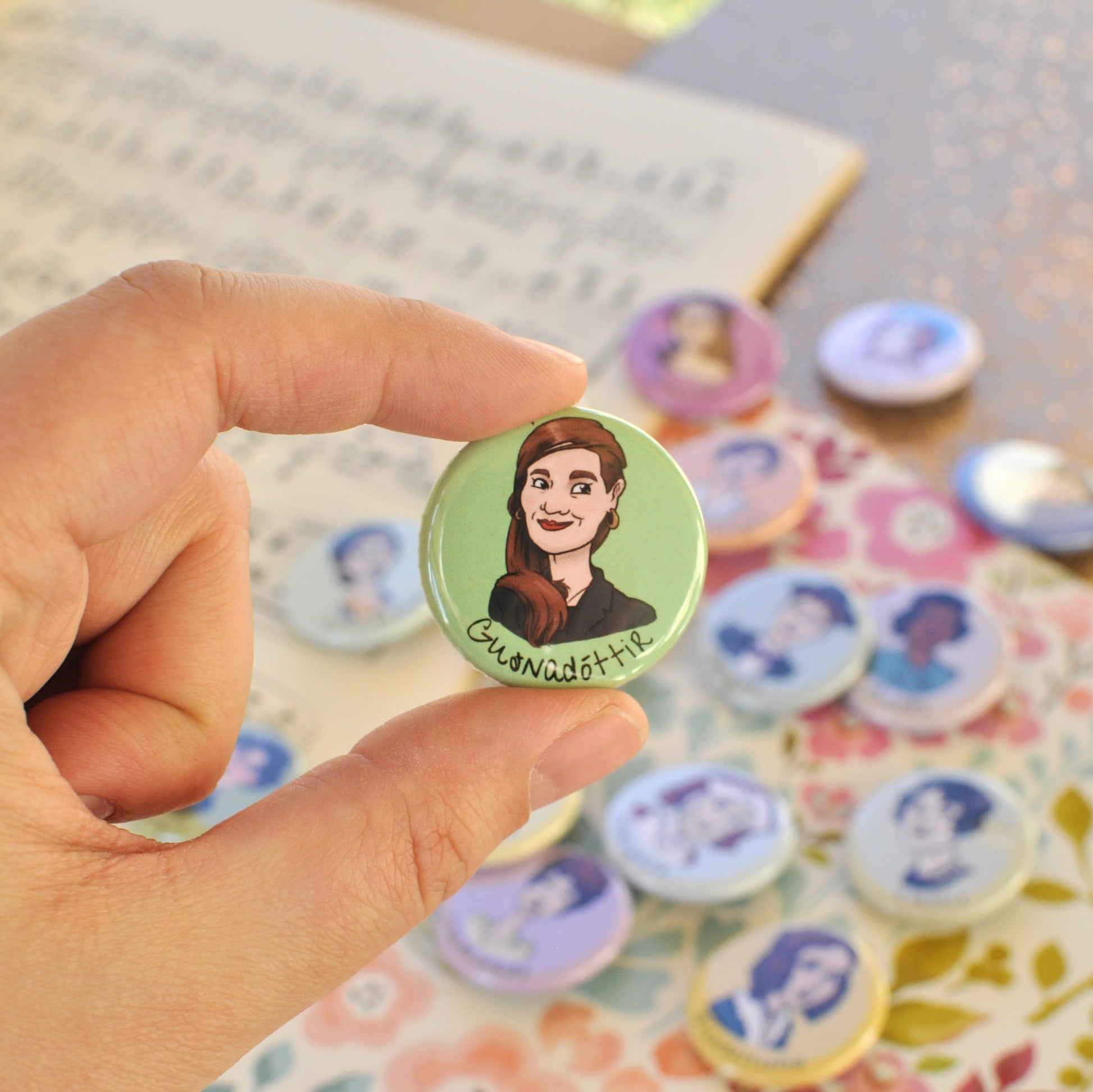 Product Details- Set includes 9 buttons. Buttons are 1.25” in size and assembled with American-made components. Contact us for bulk pricing. Note: Pinback Buttons are sharp. Please handle with care.